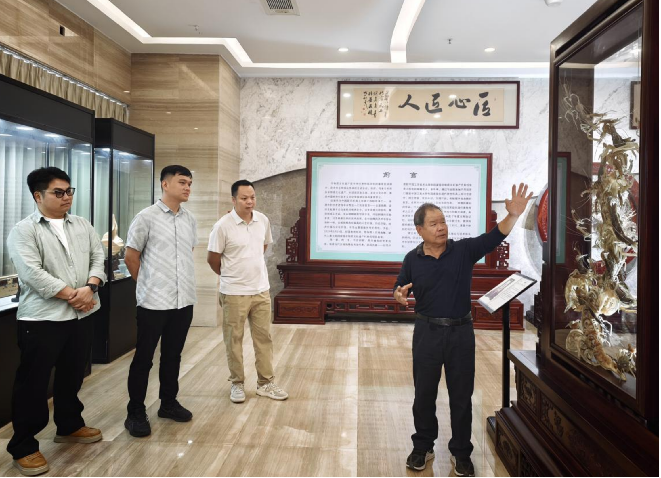 学院团队通过与中国工艺美术大师、国家级非遗合浦角雕传承人白耀华、广西工艺美术大师龚辉琼深入交流,实地了解玉雕、合浦角雕的非遗文化内涵、传统工艺技法与行业人才需求,围绕岗位供给、实习实训、技艺传承等方面展开探讨。