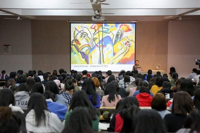 张敢教授还介绍了许多具有代表性的作家及作品,讲到西方艺术世界中心从巴黎转移到纽约的美国抽象表现艺术以及后现代主义视觉艺术,其中就包括了表现艺术与观念艺术、大地艺术与场所艺术以及女性主义艺术。从中不难看出,许多作品都体现了艺术与生活之间的关系。张敢教授表示,要正确使用科学分析生活元素,培养正确的科学素养。