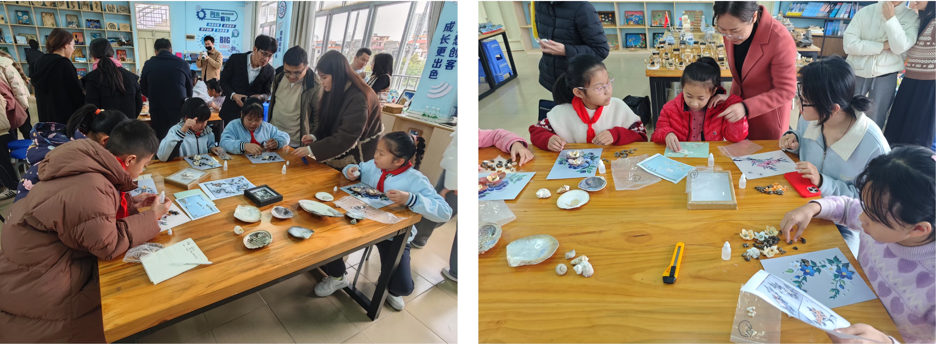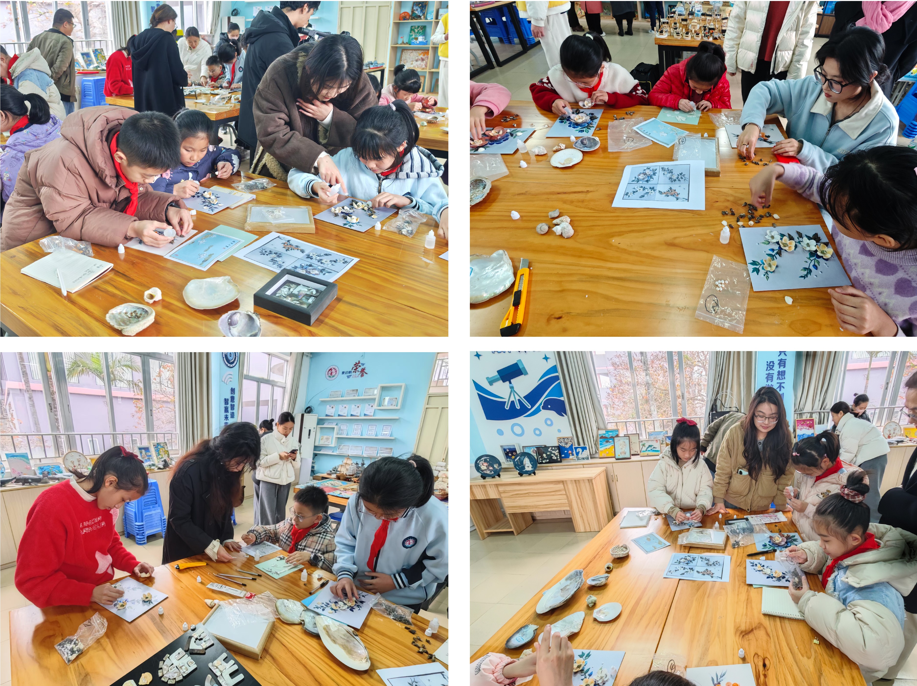 北艺学子指导实验学校学生制作贝雕画