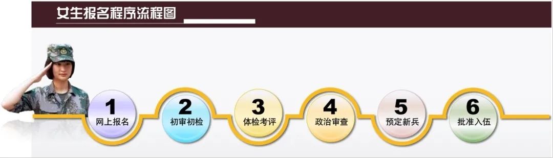 参加政治初考和体格初检:按应征地市级征兵办公室的安排,持《应征女青年网上报名审核表》并携带本人身份证、学历证及相关材料,到指定地点参加初考初检,合格者确定为送检对象。
