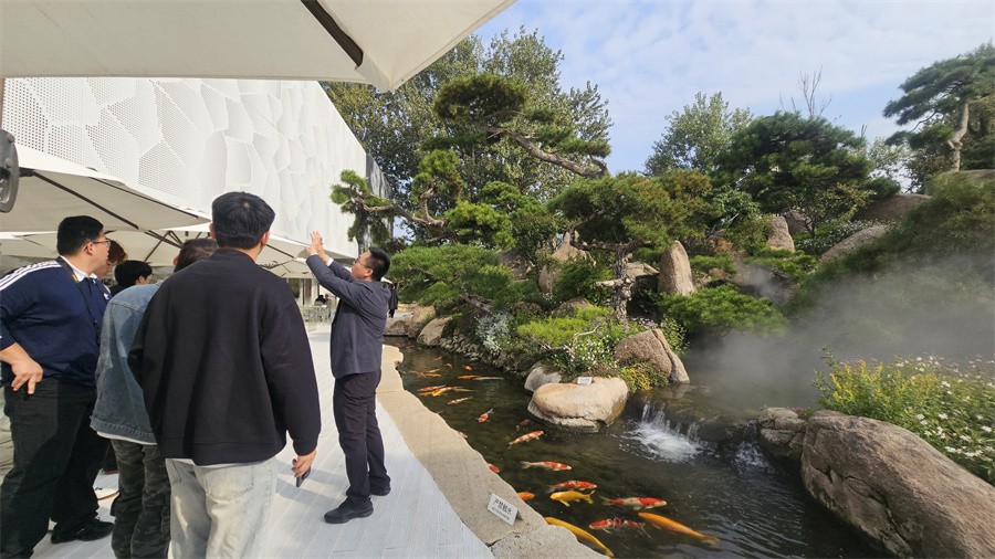 实践活动首站是罗红摄影艺术馆,为确保调研实效,教学团队提前制定“任务驱动式”教学方案,向学生下发包含“元素解析、空间对比、美学提炼”三大模块的考察任务书,引导学生以目标为导向开展现场调研。现场教学中,教师团队重点拆解艺术馆东方园林景观群的设计巧思,从松石布局的层次构建、水雾系统的氛围营造,到锦鲤与水体的生态互动关系,系统解析自然元素的组合逻辑。同时,教师通过对比黑天鹅蛋糕店区域的功能划分与摄影展区的设计差异,从空间规划、材料选型、生态美学表达等维度,深入探讨“沉浸式景观”的构建路径与实施要点,帮助学生建立艺术空间景观设计的系统认知。