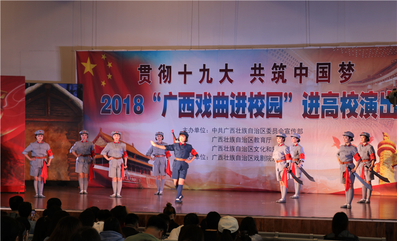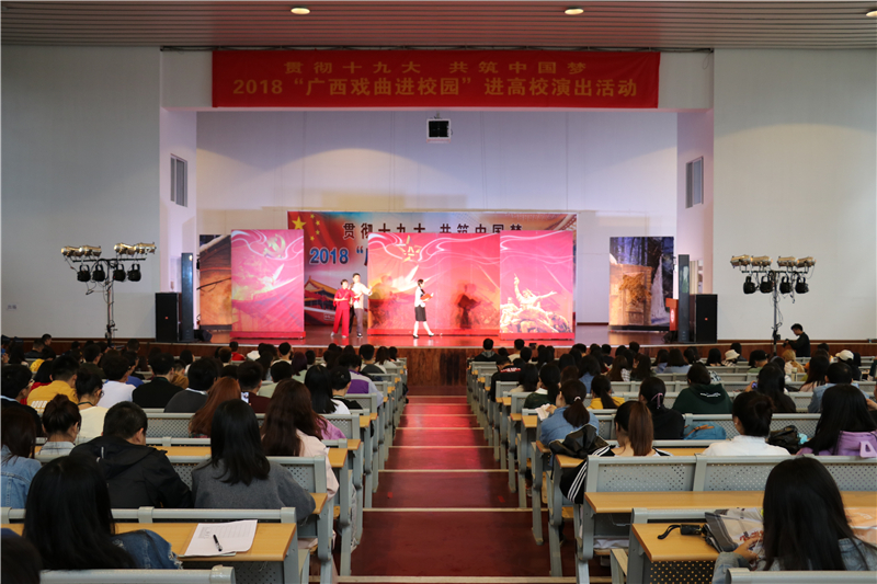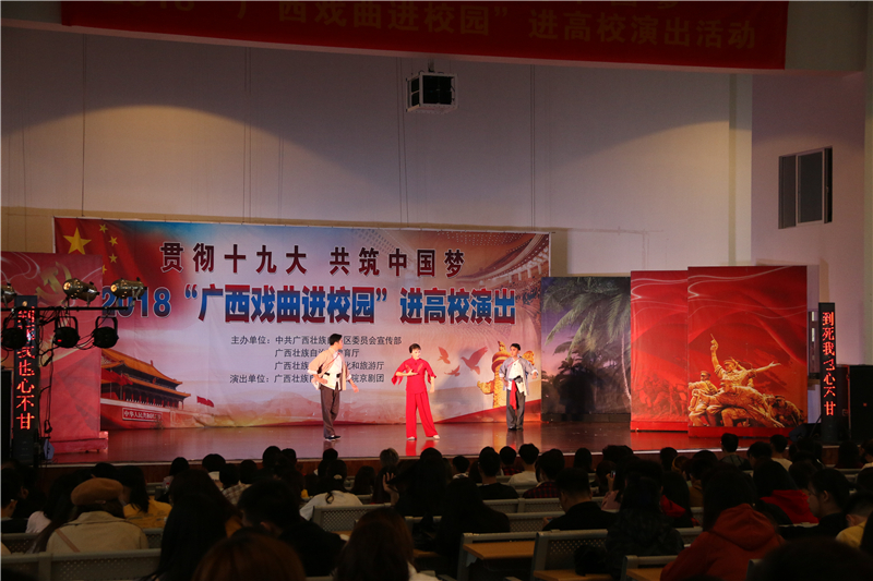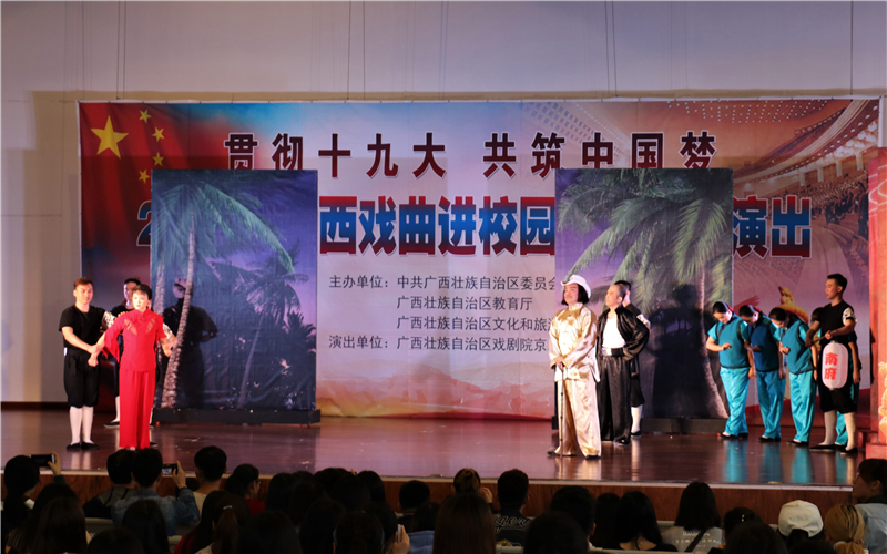 为了弘扬中华传统文化和地方优秀戏曲文化,丰富校园文化生活。12月1日下午,以“贯彻党的十九大,共筑中国梦”为主题的2018“广西戏曲进校园”活动在我校大礼堂精彩上演,吸引了广大师生前来观看。此次活动由自治区党委宣传部、自治区教育厅、自治区文化和旅游厅主办、北海艺术设计学院协办、自治区戏剧院京剧团出演。
