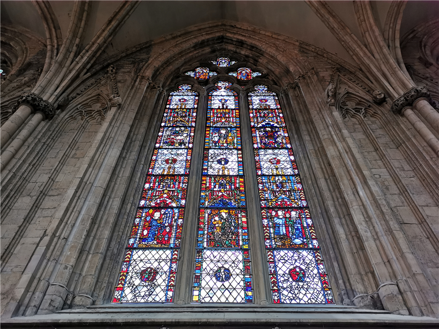 告别了剑桥,第二天我们来到了英国最著名的文化旅游城市约克。到了约克,在英国旅行可看的教堂很多,但约克大教堂绝对是可以排在前几名的必看教堂之一。约克大教堂是欧洲北部最大的哥特式教堂之一,始建于1230年,1472年完工,整个工期耗时两百多年。教堂内各个方向的彩绘玻璃,其中大东窗是全世界最大的中世纪彩绘玻璃,南面有一扇圆形的“玫瑰窗”,被称作“哥德建筑的眼睛”。对于学习环艺的同学来说,是不可多得的一次西方建筑学实地学习的机会。