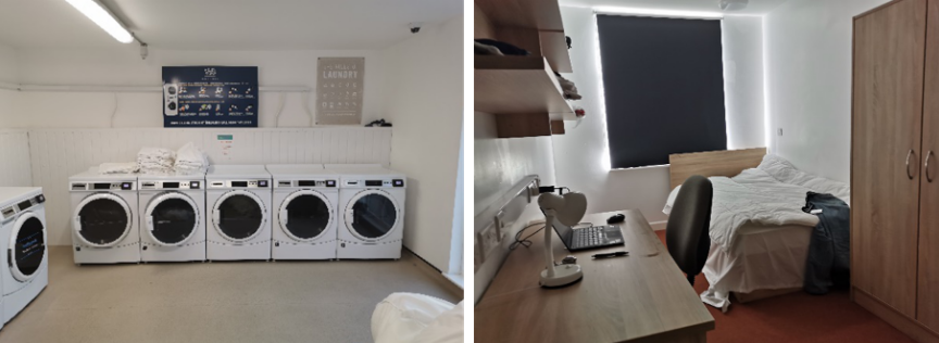 每个同学都有一间配备独立卫生间的卧室,小巧而舒适。白天晴朗的日子,英国的太阳堪比北海,必须放下窗帘。大家收拾好房间,肚子就咕咕叫了,相约步行到德比市中心的购物中心 IntuDerby 吃饭。饭后最重要的事情,要购置今后一个月生活的必需品。因为英国人很少吃米饭,电饭煲不是厨房的标配,同学们买了衣架、洗衣液、洗洁精还有中国人离不开的菜刀。俨然把这里当成自己家一样!