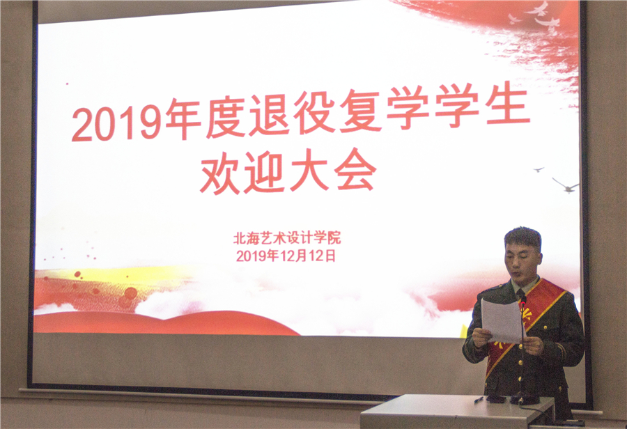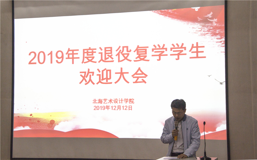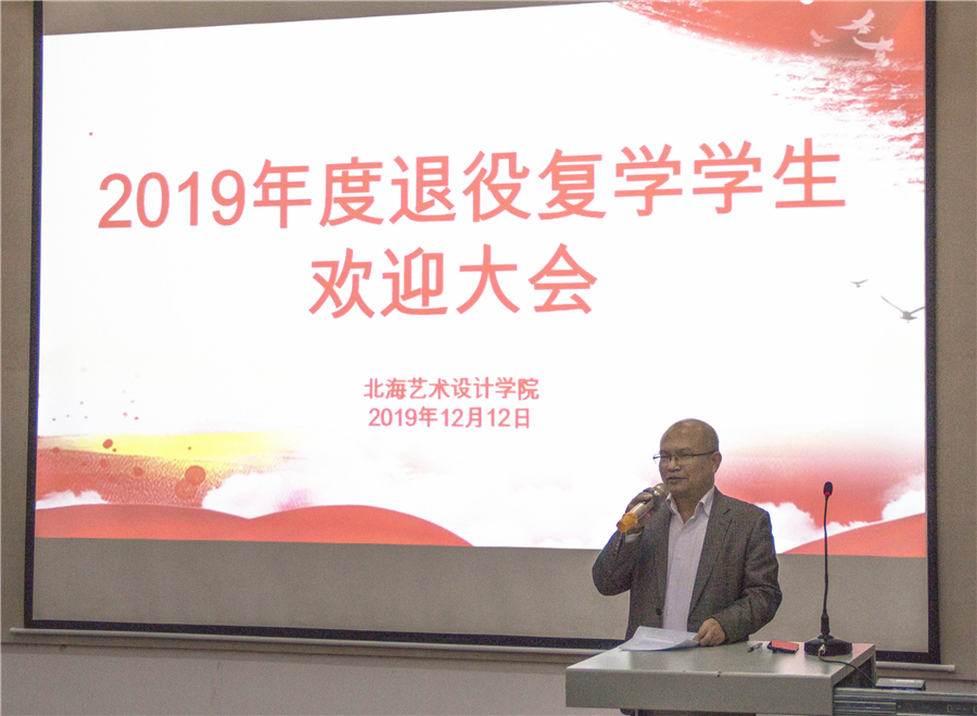 12月12日下午,我校举行2019年度退役复学学生欢迎大会。学校党委书记李高南、学校党委副书记副校长彭仁、学工处处长王明森、学工处副处长班媚、设计学院副院长庞定坤、环艺学院副院长岳莹、环艺学院副院长唐道明、人文艺术学院副院长邓欢、美术学院副院长王习银,以及40名2019年退役复学学生、部分学生代表出席会议。会议由学校学工处副处长刘玲花主持。